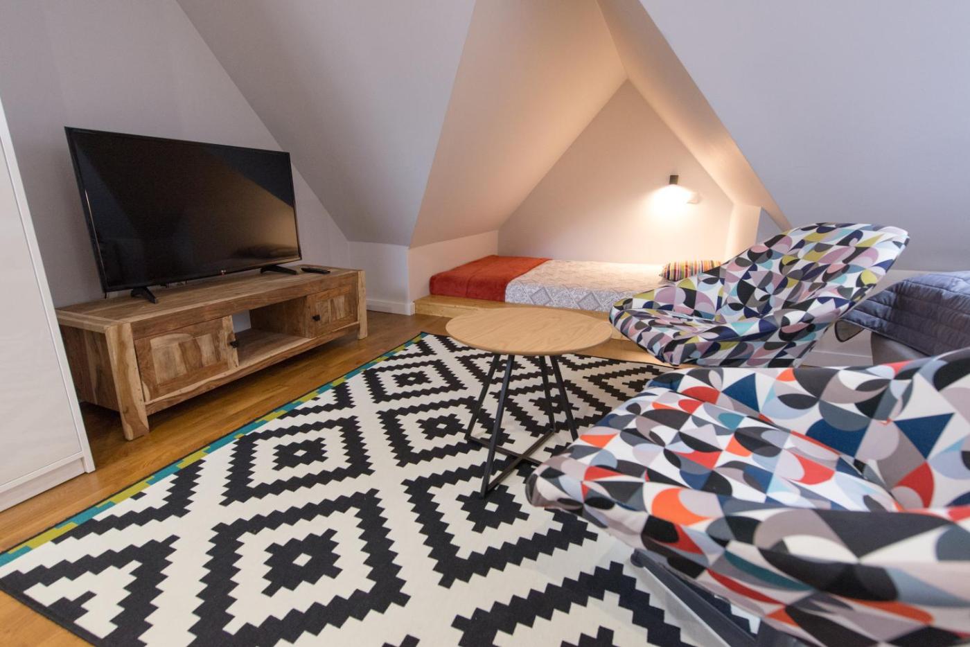 Studio typu Deluxe. The studio offers a dining area, a wardrobe, as well as a private bathroom boasting a walk-in shower and a hairdryer. Meals can be prepared in the well-fitted kitchenette, which has a stovetop, a refrigerator, a dishwasher and kitchenware. The studio features a flat-screen TV with cable channels, a washing machine, a private entrance, a tea and coffee maker as well as mountain views. The unit has 2 beds. Studio - 4 osobowy. Powierzchnia pokoju ok.: 30 mkw.