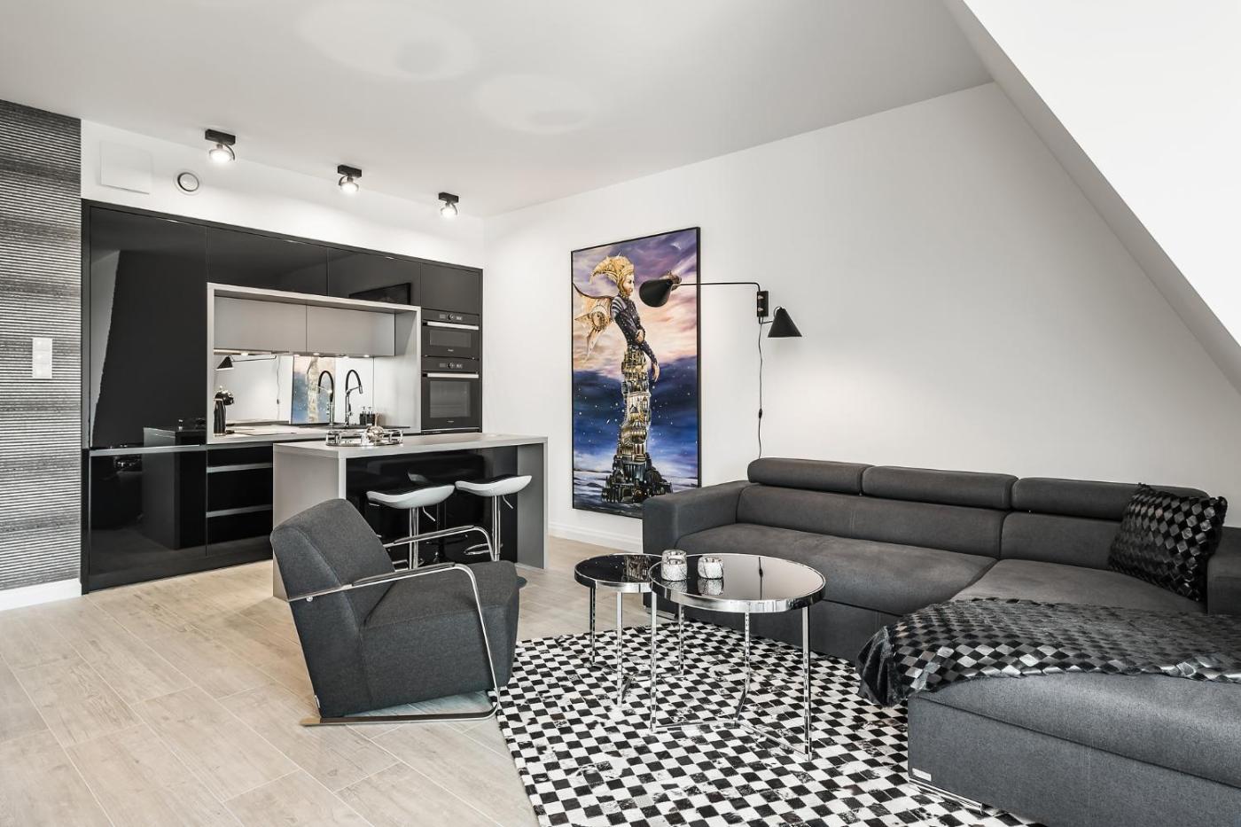 Oferta apartamentu obejmuje sypialnię (1), salon, kuchnię z pełnym wyposażeniem, w tym lodówką i ekspresem do kawy, a także łazienkę (1) z prysznicem oraz suszarką do włosów. W apartamencie zapewniono ręczniki i pościel.